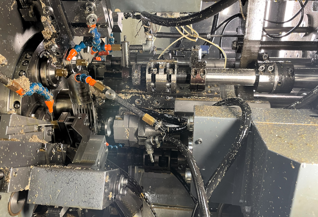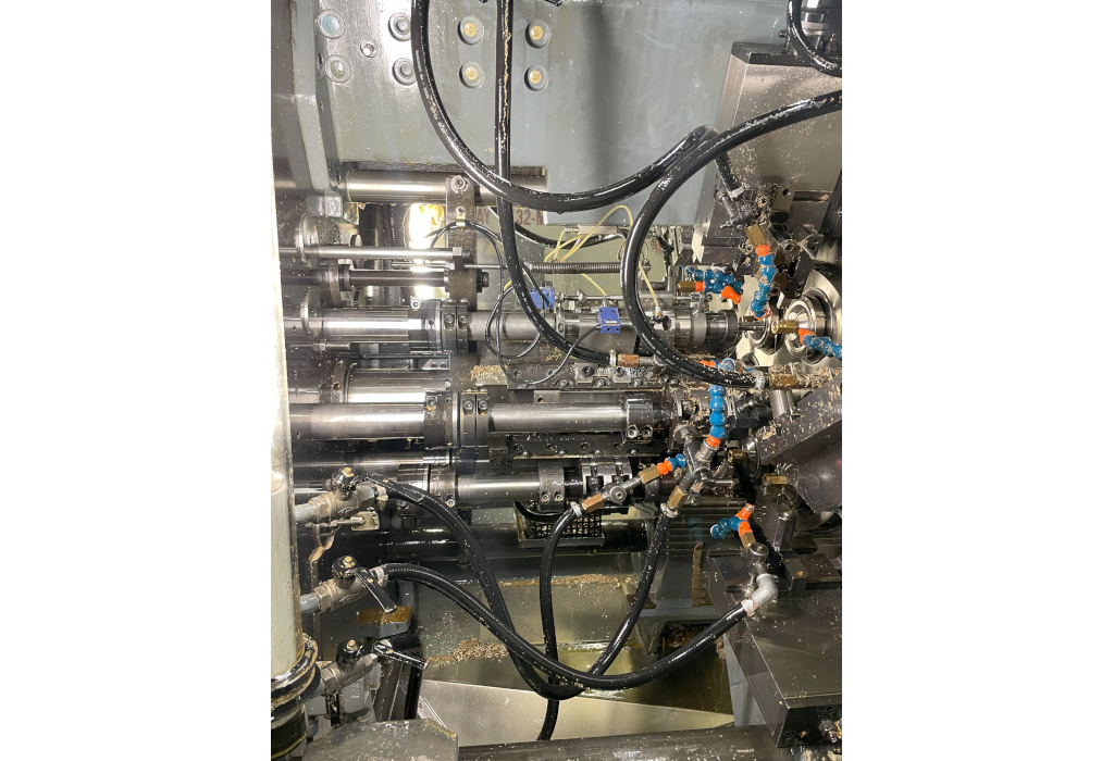 Schütte SF 42 AC automatic multi-spindle lathe from 2006, in excellent condition and ready for immediate production use. This 6-spindle machine is a complete solution, equipped with essential accessories to maximize efficiency. It includes a Pietro Cucchi integral automatic bar loader, a practical chip conveyor, and the AC pick-up system with motor drive for rapid and precise second operations. The machine is also fitted with a threading unit and comes complete with new bearings (to be installed), numerous tool holders, cams, and various other accessories included. This is a solid opportunity for anyone seeking a reliable and high-performing Schütte machine.